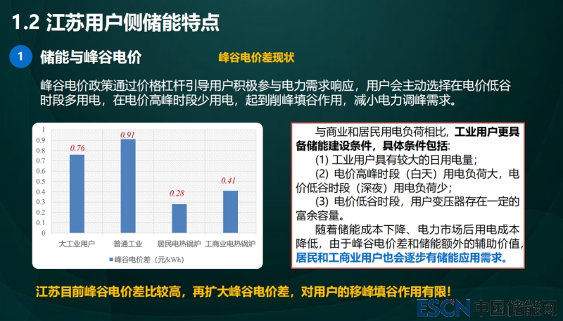 這是江蘇電價(jià)差的情況,我們普通工業(yè)用戶電價(jià)差是0.91元,全國資源比較好的地區(qū),大工業(yè)用戶是0.76元,居民電熱鍋爐0.28元,工商業(yè)電用戶0.41元。目前江蘇的價(jià)差比較高,如果再擴(kuò)大峰谷價(jià)差,對(duì)用戶的移峰填谷的作用相應(yīng)的比較不明顯。這個(gè)東西不是一成不變的,大家鎖定這個(gè)目標(biāo),有可能會(huì)走偏。