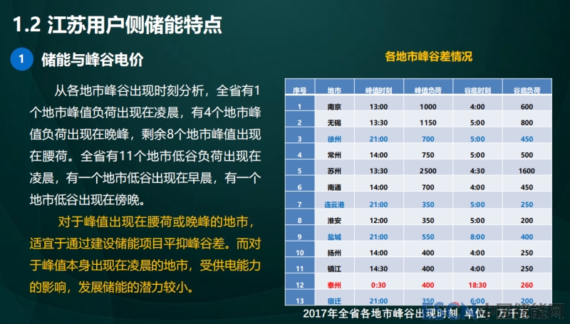 江蘇用戶側(cè)儲(chǔ)能特點(diǎn),三個(gè)部分。儲(chǔ)能峰谷電價(jià),江蘇峰谷電價(jià)算是一個(gè)條件比較好的地區(qū),我把江蘇峰谷電價(jià)的情況說一下。我們物價(jià)局《關(guān)于創(chuàng)新和完善促進(jìn)綠色發(fā)展價(jià)格機(jī)制的實(shí)施意見》里面對(duì)電價(jià)機(jī)制做了一些設(shè)計(jì),里面包括了完善峰谷電價(jià)的機(jī)制,鼓勵(lì)用戶削峰填谷,這是我們的一個(gè)政策導(dǎo)向。還有鼓勵(lì)參加電力市場(chǎng)交易主體簽訂峰、谷、平段價(jià)格和電量的交易合同。峰谷電價(jià)差、輔助服務(wù)補(bǔ)償市場(chǎng)化機(jī)制也鼓勵(lì),還有鼓勵(lì)電動(dòng)汽車提供儲(chǔ)能服務(wù),這個(gè)說了好多年,具體怎么做大家還是比較困惑。因?yàn)槲覀僔T2(音譯)技術(shù)實(shí)驗(yàn)室已經(jīng)研究出來了,但是在社會(huì)上推廣應(yīng)用,我們看到的都是概念性的,還沒有真正有人把這個(gè)東西用很好,也有很多顧慮,認(rèn)為這個(gè)東西對(duì)車的傷害和損失比較大,這個(gè)也是一個(gè)問題。另外一個(gè)推行居民的峰谷電價(jià)。