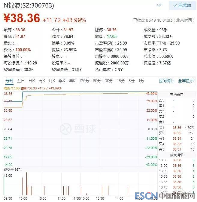 中國儲能網(wǎng)訊:2019年3月19日,寧波錦浪新能源科技股份有限公司上市掛牌儀式在深圳證券交易所舉行,股票簡稱“錦浪科技”,股票代碼“300763”,保薦機構(gòu)和主承銷商為海通證券股份有限公司。本次發(fā)行股票數(shù)量2,000萬股,發(fā)行價格26.64元/股,新股募集資金總額53,280.00萬元。