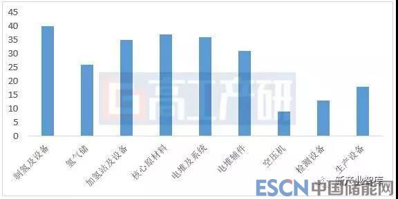 從現(xiàn)有企業(yè)分布的結(jié)構(gòu)來看,主要分布在電堆用核心材料、電堆及系統(tǒng)等環(huán)節(jié),這與當前國內(nèi)燃料電池在核心材料、電堆環(huán)節(jié)的技術不成熟,與日韓差距較大的現(xiàn)狀吻合,新成的立企業(yè)在這些環(huán)節(jié)可獲得的技術進展更大。