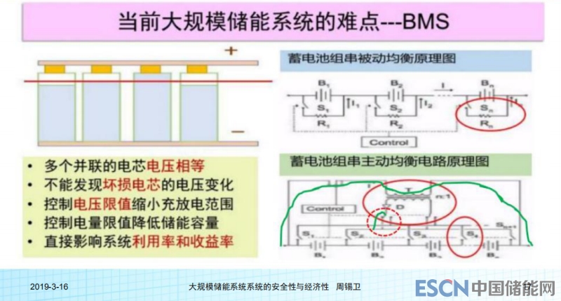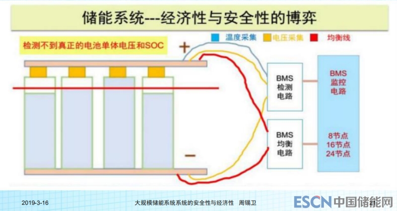 創(chuàng)新技術(shù),這一塊是非常重要的,目前講儲(chǔ)能系統(tǒng)里面實(shí)際上全球都是一樣,在大規(guī)模儲(chǔ)存里面沒有太多的創(chuàng)新技術(shù),都是其他技術(shù)移過來,比如說電動(dòng)汽車的儲(chǔ)能管理技術(shù)。現(xiàn)在國內(nèi)的BMS大部分采用的都是汽車BMS里面的專用芯片,所以成本比較高。在高成本情況下,怎么樣能夠配合在儲(chǔ)能里,把幾顆電芯并起來,并起來成本越低,檢測一個(gè)點(diǎn)芯片的成本固定了,你的電芯多的并在一起就會(huì)減低整體成本,但是帶來一個(gè)致命的危害,幾顆并在一起,這個(gè)電位,大家都學(xué)過電路最基本的原理,并聯(lián)的電路測出來的電位是一樣的,所以并有一顆偏低或者有一顆偏高,你測不到這一顆,也就違反了BMS保護(hù)電芯能測到每一顆最壞的電芯。在這種情況下采取保護(hù)測試,這個(gè)初衷就不對(duì),這個(gè)情況下經(jīng)濟(jì)性嚴(yán)重影響了儲(chǔ)能系統(tǒng)的壽命。