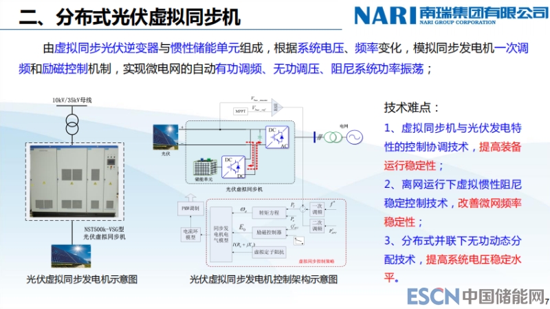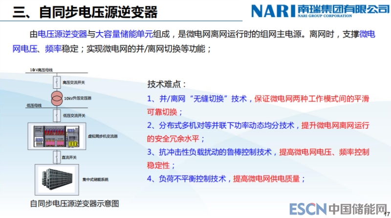 下面講自同步電壓源逆變器,剛才用光伏逆變器,這個(gè)主要用在儲(chǔ)能上面,由電壓源逆變器與大容量?jī)?chǔ)能單元組成,是微電網(wǎng)離網(wǎng)運(yùn)行時(shí)的組網(wǎng)主電源。離網(wǎng)時(shí)支撐微電網(wǎng)電壓、頻率穩(wěn)定;實(shí)現(xiàn)微電網(wǎng)的并離網(wǎng)切換等功能。下面幾個(gè)難題我們會(huì)分別介紹一下,就是說(shuō)它實(shí)現(xiàn)了這些功能。