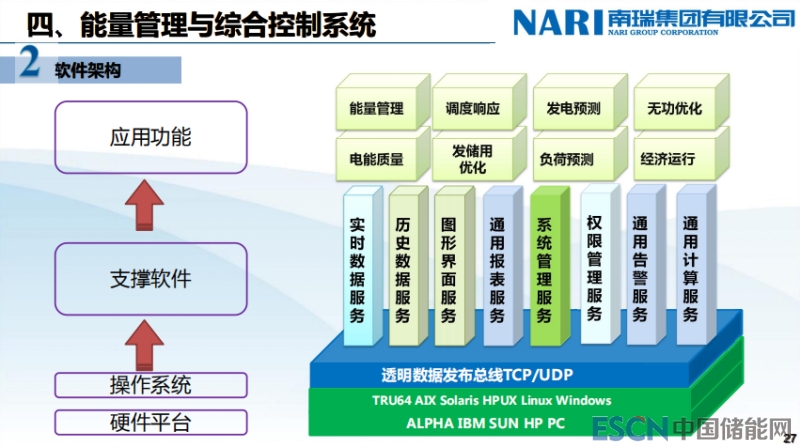 從功能上來(lái)說(shuō),底下是硬件平臺(tái),中間是操作系統(tǒng),然后是操作系統(tǒng)上的支撐應(yīng)用軟件,后臺(tái)是高級(jí)應(yīng)用。這里面是高級(jí)應(yīng)用的主要功能,第一是發(fā)電和用電的預(yù)測(cè);第二是黑啟動(dòng)控制;第三實(shí)現(xiàn)了并離網(wǎng)的切換。同步電壓源在實(shí)現(xiàn)并離網(wǎng)切換過(guò)程中,能夠?qū)崿F(xiàn)頻率穩(wěn)定平滑的自動(dòng)控制功能。下面離網(wǎng)的能量調(diào)動(dòng)和自動(dòng)電壓的控制,以及調(diào)度交換功率控制,分布電源平滑出力控制,調(diào)度交換功率緊急控制,還有配網(wǎng)聯(lián)合調(diào)度。