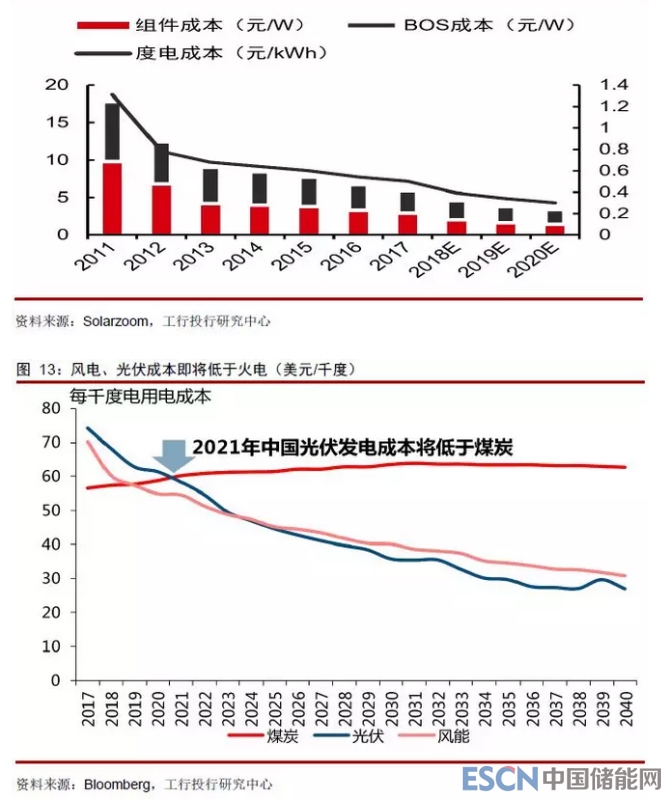 光伏發(fā)電成本不斷降低,未來(lái)將成為主導(dǎo)能源之一。當(dāng)下光伏發(fā)電量?jī)H占全球總發(fā)電量1%,發(fā)電成本高是主要掣肘。目前光伏用電成本較煤炭約高31%,但隨著各國(guó)光伏市場(chǎng)化進(jìn)程加快,光伏發(fā)電成本有望在2020年低于煤炭。從光伏產(chǎn)業(yè)鏈的價(jià)格來(lái)看,光伏級(jí)多晶硅的價(jià)格由2011年時(shí)的54美元/千克降至當(dāng)前平均9美元/千克,而組件的價(jià)格則由1.24美元/瓦降至0.22美元/瓦。光伏系統(tǒng)達(dá)到降低拉動(dòng)了光伏發(fā)電成本的降低。目前光伏組件價(jià)格繼續(xù)下跌的空間已經(jīng)不是很大,還需要依靠降低非系統(tǒng)成本來(lái)降低總的成本。BNEF 預(yù)計(jì)未來(lái)十年光伏的發(fā)電占比將逐漸上升至 10%。彭博預(yù)計(jì)至2040年光伏和風(fēng)能將占全球發(fā)電總裝機(jī)量 37%,占比是目前4倍,成為主導(dǎo)能源之一。