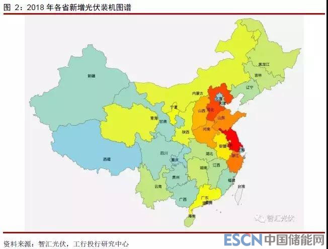 從各省的新增裝機(jī)情況來(lái)看,2018年光伏新增裝機(jī)集中在河北、江蘇、山東、浙江等東部區(qū)域。這主要是得益于分布式光伏的發(fā)展。2018年全國(guó)集中式電站和分布式光伏分別新增2330萬(wàn)千瓦和2096萬(wàn)千瓦,分布式基本上占據(jù)了半壁江山。圖2為各省新增裝機(jī)情況如下圖所示。說(shuō)明,由淺藍(lán)→黃→紅,顏色越深代表新增裝機(jī)規(guī)模越大。