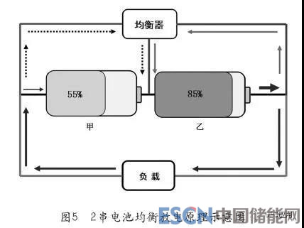 如果電池容量差異不是非常大,并且均衡電流足夠大,均衡效率足夠高,則所有電池基本上可以同時放完電,電池容量得到充分利用。2串電池放電均衡原理示意圖如圖5所示。