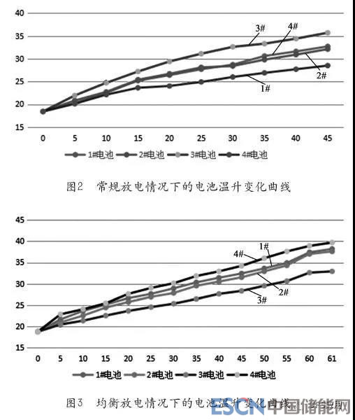 實(shí)測數(shù)據(jù)和溫升變化曲線如圖2和圖3所示,通過曲線可以明顯看到,標(biāo)準(zhǔn)放電情況下,衰減最嚴(yán)重的3#鋰電池,溫速度非???無論是溫度的絕對值,還是升高速度都明顯超過其它衰減程度低的鋰電池;同樣的鋰電池組,當(dāng)使用了高效電池均衡器后,溫升情況發(fā)生反轉(zhuǎn),衰減最嚴(yán)重的3#鋰電池,溫升速度和絕對值明顯下降,在相同的放電時間點(diǎn)(45min),無論是溫度的絕對值,還是升高速度都是組內(nèi)最低的。對于整個電池組而然,使用電池均衡器后,在對應(yīng)的時間點(diǎn),單元電池的最高溫度和平均溫度均低于常規(guī)放電時的對應(yīng)溫度,發(fā)生這種情況的根本原因是均衡器的介入明顯降低了衰減最嚴(yán)重的3#電池實(shí)際放電電流,由于內(nèi)阻原因?qū)е碌臏厣恢鲃咏档汀?