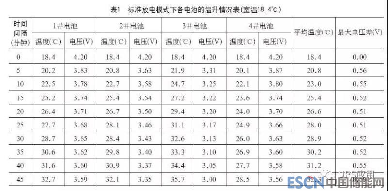為便于對比,先進(jìn)行常規(guī)放電,實(shí)測有效安全放電時間為45min,計算放電容量為1.50Ah,等于3#電池的容量,即3#電池的容量代表了整個電池組的容量,完全符合木桶短板理論。此時,其它3塊電池雖然還有較多電量,但無法釋放出來,容量浪費(fèi)嚴(yán)重。放電的同時,采用紅外線測溫儀定時對每一塊電池的外殼進(jìn)行溫度測量,并記錄相應(yīng)數(shù)據(jù),實(shí)際測量數(shù)據(jù)見表1,實(shí)測溫度數(shù)據(jù)表明,衰減最嚴(yán)重的3#電池的溫升速度和絕對值均明顯高于其它衰減程度稍低的電池。
