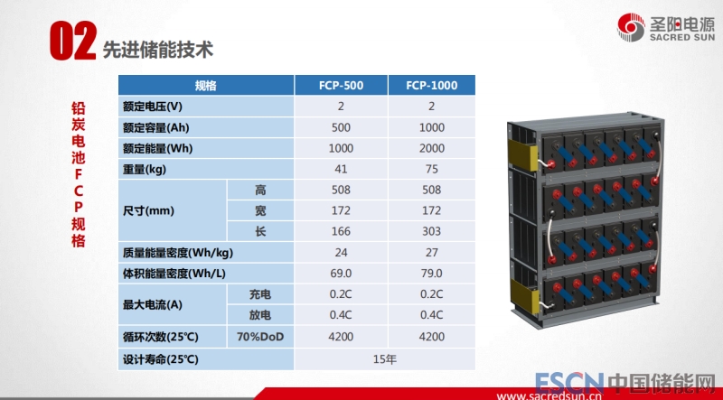 第二部分儲(chǔ)能技術(shù)。不得不說的就是電池技術(shù),我從兩個(gè)方面說,一個(gè)從鉛碳電池,一個(gè)就是鋰電池,尤其我們從2018年以后國內(nèi)的鋰電池裝機(jī)容量比例越來越高,這也是我們不可回避需要去推進(jìn)的一項(xiàng)工作。我們的鉛碳電池現(xiàn)在有大容量的鉛碳,單體容量一度電到兩度電,兩伏500,兩伏一千,小的就是12V的貨運(yùn)系統(tǒng),現(xiàn)在裝機(jī)量比較大的還是大容量的單體。這個(gè)產(chǎn)品是我們從2013年開始和日本合作推出的產(chǎn)品,專門面向大規(guī)模儲(chǔ)能的產(chǎn)品,循環(huán)壽命達(dá)到4200次,這是循環(huán)曲線。