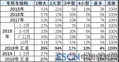 目前看,5.5米-6米的專用車很強(qiáng),19年1-2月的專用車份額達(dá)到76%。而4.5米以下的專用車因?yàn)榈统杀镜膬?yōu)勢而表現(xiàn)較好,18年回升到12%。