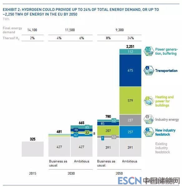 氫可以提供高達(dá)總能源需求的24%,到2050年,歐盟約達(dá)2250太瓦的能源
