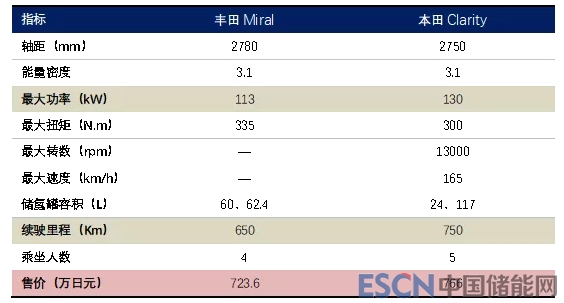 豐田和本田燃料電池汽車關鍵參數(shù)比較