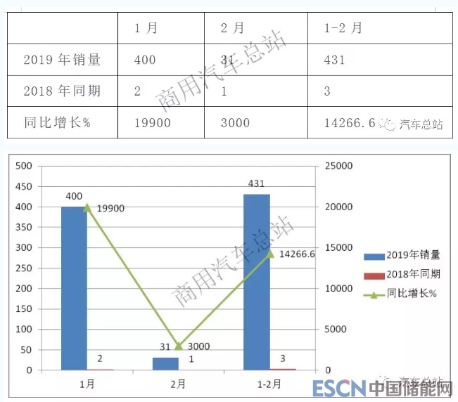 1、根據(jù)最新上牌信息,2019年1-2月氫燃料電池客車累計銷售431輛,同比(2018年1-2月累計銷售3輛氫燃料電池客車,盡管2018年全年銷售1527輛氫燃料電池汽車,其中12月單月銷售1153輛,1-11月累計銷售只有374輛)增長14266.6%。增長超過140倍,2019年可謂“開門暴漲”。