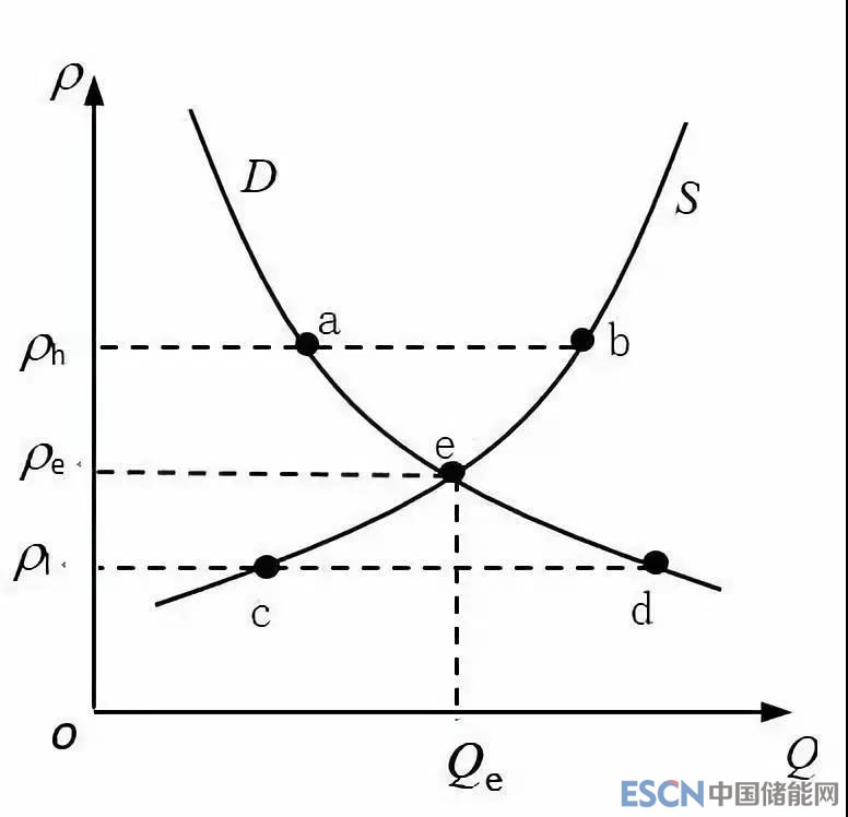 用微觀經(jīng)濟學(xué)中經(jīng)典的供給與需求分析來說明市場機制及市場價格的決定。如圖3所示,假定決定供求的因素除商品自身的價格外其余均為已知,因而供求狀況確定。圖中曲線S表示供給曲線,曲線D表示需求曲線。由圖3可見,曲線S和D在e點相交,與e點相對應(yīng)的價格ρe就是均衡價格,或者叫市場出清價格。因為在此價格水平上,買方愿意并能夠購買的數(shù)量與賣方愿意并能夠供給的數(shù)量恰好相等。所謂市場機制就是指在一個自由市場里能使價格得以變化一直達到出清(即供給量與需求量相等)的趨勢。