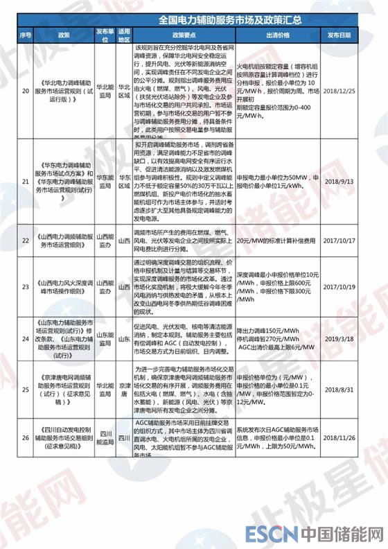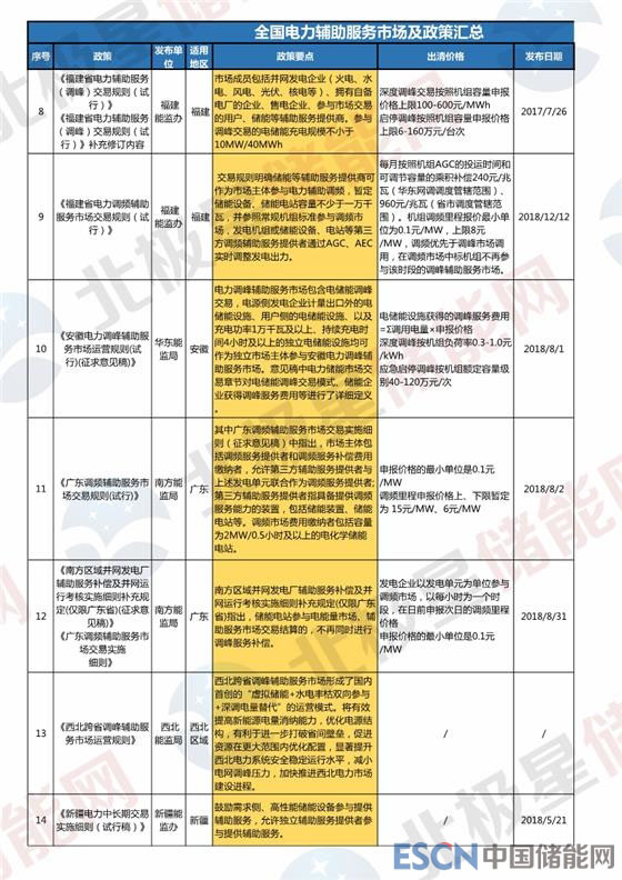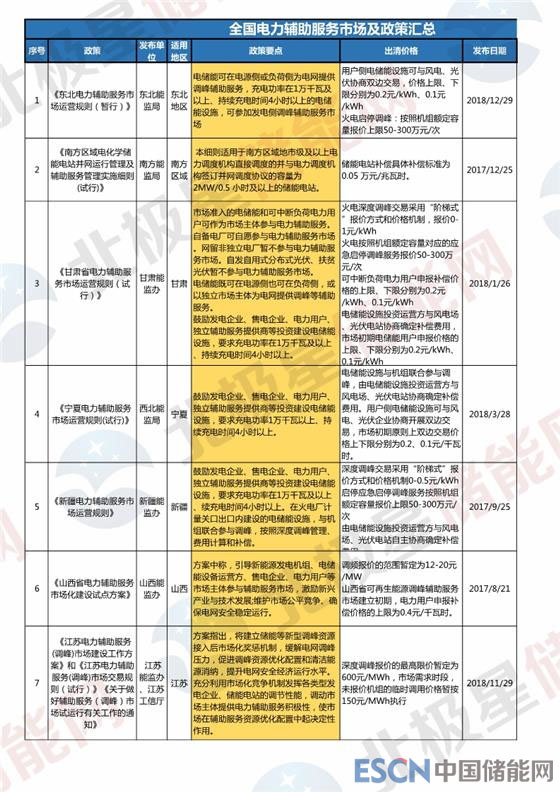 2017年國家能源局將東北、山西、福建、山東、新疆、寧夏、廣東、甘肅等8個地點作為第一批電力輔助服務(wù)市場試點,2018年多省陸續(xù)又發(fā)布了電力輔助服務(wù)市場開啟運營規(guī)則,儲能可參與的電力輔助服務(wù)市場范圍進(jìn)一步擴大。