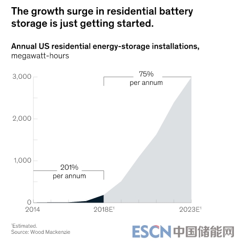 在過去的四年中,美國的住宅儲能系統(tǒng)的部署每年大幅增長,增長率超過200%,預(yù)計將會繼續(xù)快速增長(圖表1)。2018年,住宅儲能系統(tǒng)甚至首次超過公用事業(yè)規(guī)模的儲能系統(tǒng),這反映出客戶正致力于擁有自己的高價值儲能系統(tǒng)。