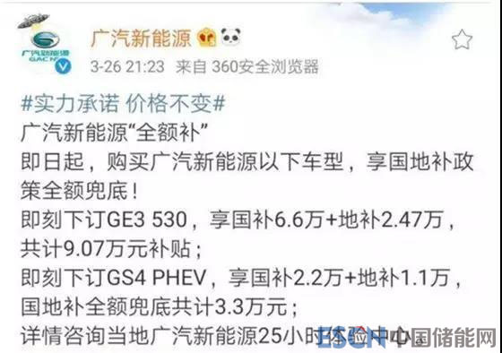 傳統(tǒng)車企廣汽新能源也不甘落后,幾乎與蔚來(lái)汽車同時(shí)宣布,為旗下GE3 530、GS4 PHEV兩款車型提供國(guó)補(bǔ)地補(bǔ)全額兜底,不過(guò)截止時(shí)間并未明確指出。上汽榮威、比亞迪、江鈴易至等多家整車廠也緊隨其后宣布國(guó)補(bǔ)地補(bǔ)的全額墊付,并且墊付時(shí)間延續(xù)到整個(gè)過(guò)渡期結(jié)束。