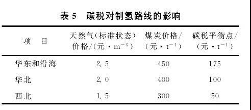 以2015年上海地區(qū)天然氣價格2.5元/m3、煤炭價格450元/t測算,當碳稅為175元/t時,采取煤制氫工藝相對于天然氣制氫工藝,在成本上失去優(yōu)勢。以華北地區(qū)天然氣價格2.0元/m3、煤炭價格450元/t為基準,當碳稅為100元/t時,采取煤制氫工藝相對于天然氣制氫工藝,在成本上失去優(yōu)勢。以西北地區(qū)天然氣價格1.5元/m3、煤炭價格300元/t為基準,當碳稅為50元/t時,采取煤制氫工藝相對于天然氣制氫工藝,在成本上失去優(yōu)勢。