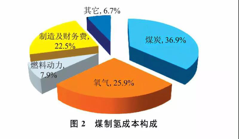 煤制氫成本構(gòu)成見圖2。從圖2可以看出,煤制氫成本主要由煤炭、氧氣、燃料動力能耗和制造成本構(gòu)成,但煤炭費用的比例遠小于天然氣費用的比例,僅占36.9%。一般煤制氫氣采用部分氧化工藝,按照配套空氣分離裝置氧氣成本測算,占氫氣生產(chǎn)的25.9%。由于煤制氫氣投入大,制造及財務(wù)費用成為重要的成本影響因素,占比達到22.5%。燃料動力費用占7.9%,其它占6.7%。