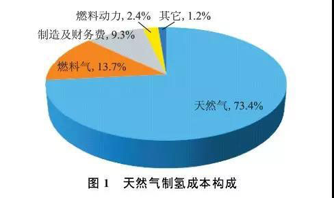 天然氣制氫成本構(gòu)成見圖1。從圖1可以看出,天然氣制氫成本主要由天然氣、燃料氣和制造成本構(gòu)成,其中天然氣價格是最主要因素,占73.4%。燃料氣是成本的第二因素,占13.7%。按照總投資70%融資考慮,制造及財務(wù)費將占成本構(gòu)成的9.3%。除燃料氣外的燃料動力能耗占2.4%。其它費用占1.2%。