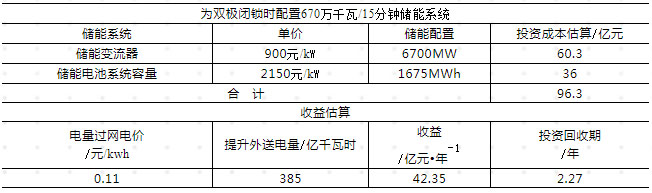 在PSASP仿真平臺中搭建河南電網(wǎng)算例,模擬天中直流在輸送800萬千瓦功率時發(fā)生最惡劣的雙極閉鎖故障時,探索儲能在系統(tǒng)穩(wěn)定過程中的效果及所需儲能容量的大小;同時,以天中直流輸送通道為載體,分析在受端河南電網(wǎng)布局一定容量的儲能系統(tǒng)作為送端新疆電網(wǎng)的跨區(qū)備用容量源,對新能源發(fā)電占比提升的促進程度。得出投入670萬千瓦/15min儲能系統(tǒng),可提高長南線與天中直流770萬千瓦的穩(wěn)定送功率,提升385億千瓦時的外送電量,設(shè)定一年內(nèi)的通道利用小時數(shù)約為5000h,計算結(jié)果如表1所示,項目的投資回收期約2.27年。