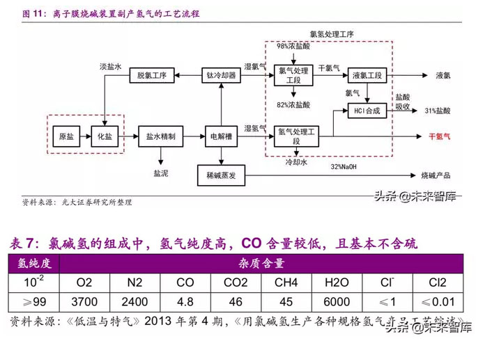 目前包括天然氣重整和煤氣化在內(nèi)的化石燃料制氫盡管適用于大規(guī)模工業(yè) 制氫,但是工藝復(fù)雜、投資較大且能耗較高;焦炭行業(yè)副產(chǎn)的焦?fàn)t氣中雖有大 量氫氣可供提純,但焦?fàn)t氣中氫氣含量(vol)僅有 55%,且伴生大量一氧化碳 和硫化物,因此氫氣提純和精制成本相對(duì)較高。而國(guó)內(nèi)氯堿行業(yè)目前基本上全 部采用離子膜電解路線,副產(chǎn)氫氣的純度一般在 99%以上,一氧化碳含量較低 且無(wú)化石燃料中的有機(jī)硫和無(wú)機(jī)硫,因此純化成本相對(duì)較低,目前氯堿廠用于 雙氧水生產(chǎn)、制藥、電子和石英加工的回收氫氣成本僅約1.3 元/Nm3。而從規(guī) 模上看,一套 40 萬(wàn)噸/年的燒堿裝置每年除供下游鹽酸和 PVC 裝置用氫外,仍 可外供 0.3 萬(wàn)噸氫氣。