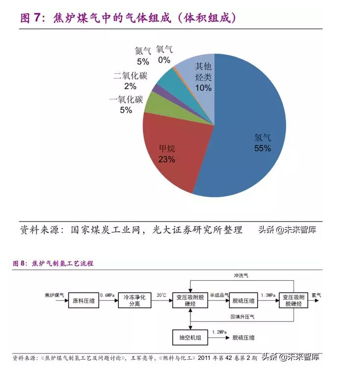 近年來(lái)由于環(huán)保要求趨嚴(yán),大部分焦炭裝置副產(chǎn)的焦?fàn)t煤氣下游都配套了 深加工裝置,用來(lái)作為合成氨、甲醇、LNG、合成氣制烯烴、合成氣制乙二醇 等裝置的原料。部分鋼廠配套建設(shè)的焦化廠,少數(shù)企業(yè)經(jīng)變壓吸附裝置提純氫 氣,作為冷軋廠等生產(chǎn)過(guò)程的保護(hù)氣或作為商品氣出售。除了上述應(yīng)用途徑之 外,仍有 50%左右的焦?fàn)t煤氣作為城市煤氣或企業(yè)自身燃料回爐助燃,因此理 論上全國(guó)焦化行業(yè)可以提供 325 萬(wàn)噸副產(chǎn)氫氣用來(lái)滿足燃料電池需求。