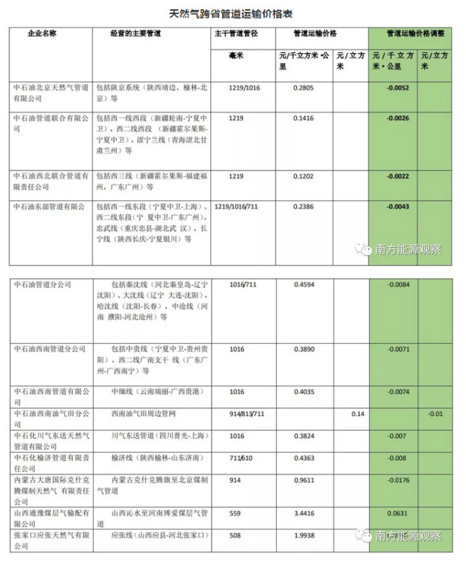 這是自2017年8月國家發(fā)改委核定跨省天然氣管道運輸價格以來,第二次調(diào)整跨省天然氣管道運輸價格。通過對比兩次核定的管道運輸價格,可以看到,此次跨省天然氣管道運輸價格下調(diào)了2厘到6分多/千立方米·公里不等。