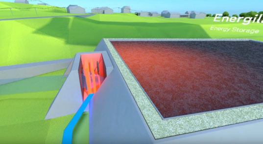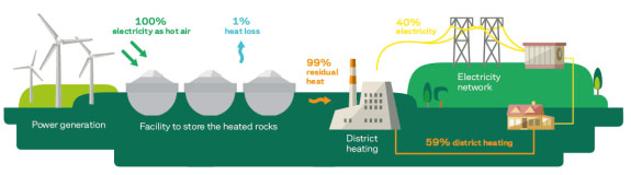 其熱儲能設施由一堆絕熱的石頭組成,加熱到600℃,由風力渦輪機的剩余電力提供能量。在一段時間之后,當再次需要能量時,將其熱量通過水蒸氣驅動發(fā)電機產(chǎn)生電力,余熱供給區(qū)域供熱。