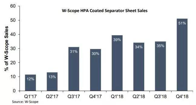 W-Scope在2018年第四季度報(bào)告中顯示,作為總銷售額的比例,HPA涂層隔板的銷售比例躍升至51%,而前四個(gè)季度的平均銷售量約為34%。W-Scope兩年前宣布,而對(duì)于2020年,W-Scope預(yù)測(cè)預(yù)期銷售收入將進(jìn)一步增加,比2019年的高出50%,主要是因?yàn)榱硗馑臈lHPA涂層隔膜生產(chǎn)線的資本支出,以應(yīng)對(duì)相關(guān)的涂層隔膜供應(yīng)合同與電動(dòng)汽車行業(yè)。