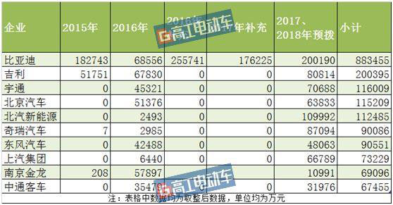 其中,比亞迪拿到的總金額最高,包括控股子公司在內(nèi)補(bǔ)貼總額為89億元,占本次補(bǔ)貼總金額的近3成。其中2017、2018年的預(yù)撥款20億,終審補(bǔ)貼共有69億,分別為2015年終審18.3億、2016年6.9億、2016年補(bǔ)充25.6億、2017年補(bǔ)充17.6億。
