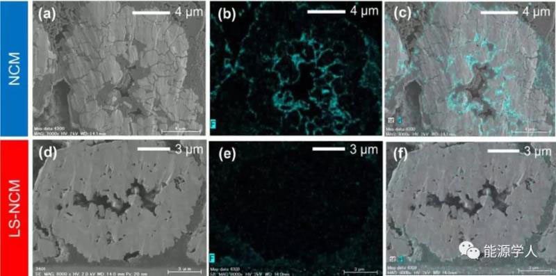 Figure 4. 在30℃下,0.1C的倍率在3.0V和4.6V之間的充放電,循環(huán)100次后,a, d)NCM和LS-NCM顆粒的橫截面SEM圖像;b, e)NCM和LS-NCM顆粒的EDX F映射;c, f)以及NCM和LS-NCM顆粒的疊加圖像。