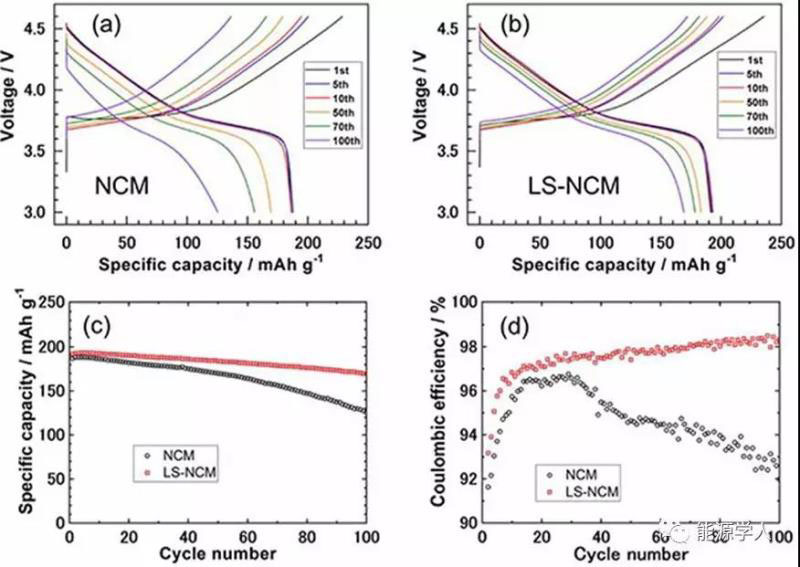 Figure 3. 以0.1C的倍率在3.0V和4.6V之間的充放電,a-d)NCM(a),LS-NCM(b)的充放電曲線,放電容量的變化(c)和庫侖效率(d)。