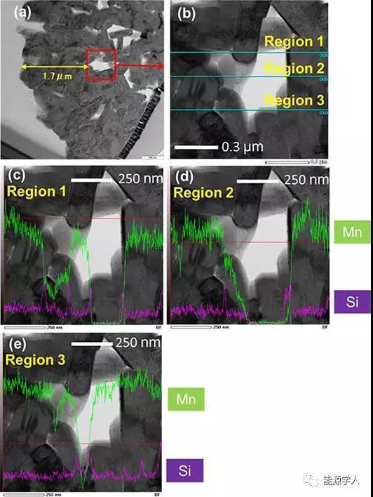 Figure 2. a, b)LS-NCM的橫截面TEM圖像;c-e)區(qū)域1(c),區(qū)域2(d)和區(qū)域3(e)中Si和Mn的EDX線輪廓圖,圖像(b)是(a)的紅色矩形部分的放大圖。