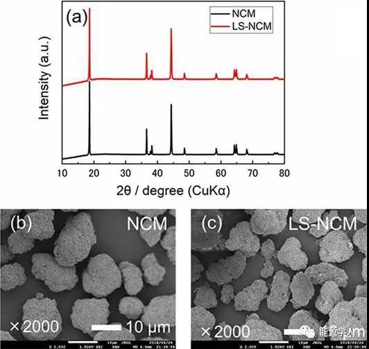 Figure 1. a)NCM和LS-NCM的X射線衍射圖;b-c)NCM(b)和LS-NCM(c)的SEM圖像。