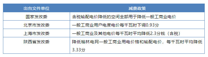 同期國家發(fā)改委、北京、上海、陜西等市也相繼發(fā)布相關(guān)降低電價政策。