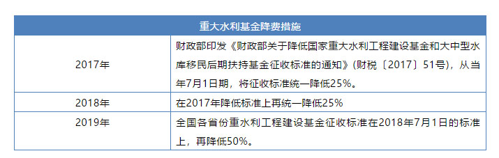 政府性基金。重大水利基金從2010年1月1日起開始征收,至2019年12月31日止。最近三年,該基金連續(xù)降低征收標(biāo)準(zhǔn)。
