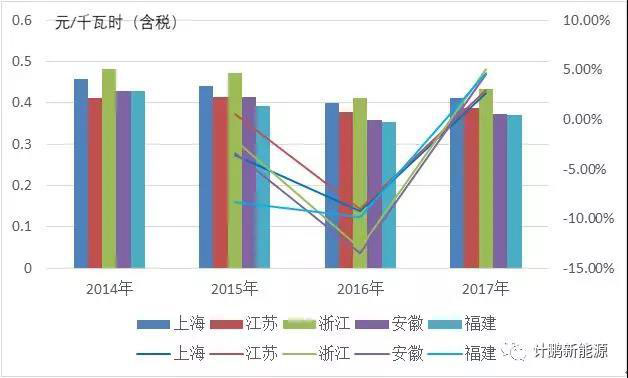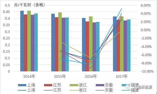 2014~2017年華東電網(wǎng)燃煤機(jī)組標(biāo)桿上網(wǎng)電價及增長率