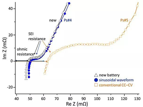 為驗(yàn)證弦波充電法對(duì)于電池內(nèi)部SEI膜阻抗的影響情形,研究人員利用電化學(xué)阻抗圖譜(EIS)對(duì)電池進(jìn)行分析,結(jié)果顯示使用此充電法進(jìn)行600次循環(huán)后的電池比起使用傳統(tǒng)CC-CV的電池,有效抑制了SEI膜的成長(zhǎng),并能保持與全新電池內(nèi)部阻抗相近的水平,說(shuō)明此充電法對(duì)于鋰離子電池內(nèi)部材料結(jié)構(gòu)的破壞情形較小,而能提供電池更長(zhǎng)的使用壽命,故此充電法將提供鋰離子電池產(chǎn)品使用者更好的選擇。