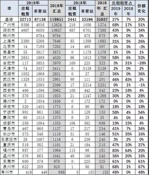 北京由于6萬指標(biāo)限制,沒有持續(xù)放號(hào),指標(biāo)缺乏,因此19年1月北京銷量增速也是較低的。貴陽、廈門、福州等的出租租賃比例較強(qiáng)。