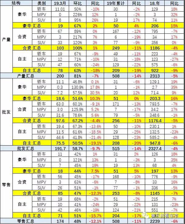 在3月生產(chǎn)中,豪華品牌的生產(chǎn)同比零增長(zhǎng),合資品牌增長(zhǎng)1%,自主品牌負(fù)增長(zhǎng)20%。19年1到3月份總體來(lái)看,豪華品牌生產(chǎn)同比增長(zhǎng)5%,合資品牌和自主品牌生產(chǎn)同比下滑都是20%,