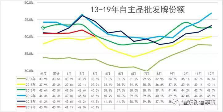 2009年3月份自主品牌份額40%,較16年、17年、18年的份額下降,增長(zhǎng)壓力較大。19年3月的自主份額相對(duì)2月走弱。
