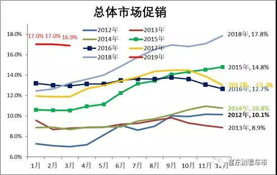 2016年車市促銷力度相對(duì)平穩(wěn),2017年處于前低中高,年末再度收縮的狀態(tài)。2018年車企促銷力度相對(duì)較大,尤其是4-12月份增長(zhǎng)相對(duì)較猛。19年3月促銷沒有明顯加大的感覺,價(jià)格促銷力度較大。