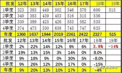 18年車市的批走勢(shì)出現(xiàn)前高后低趨勢(shì),對(duì)2019年年初壓力很大,19年3月份達(dá)到192萬(wàn)臺(tái),同比增長(zhǎng)-10%,3月批發(fā)回歸到16年3月水平。