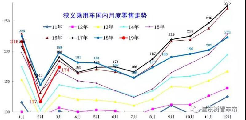 19年春節(jié)前旺銷期短,節(jié)后休眠期長(zhǎng),綜合導(dǎo)致1-3月累計(jì)增速偏低。由于2018年1-3月零售累計(jì)增速4.6%,高于年度增速11個(gè)百分點(diǎn),是春節(jié)因素的大年。而2019年是春節(jié)因素的小年,雖然3月環(huán)比2月回升57萬(wàn)臺(tái)的回升較好,但單月和累計(jì)仍是1-3月的開局呈現(xiàn)歷年的增速偏低位。