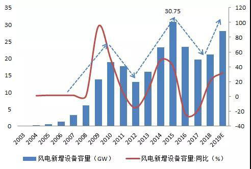 2015年因風(fēng)電標(biāo)桿電價(jià)下調(diào)出現(xiàn)搶裝行情,年度新增裝機(jī)30.75GW,創(chuàng)下近十年風(fēng)電年度新增規(guī)模之最。在風(fēng)電管理政策調(diào)整下,2019年預(yù)計(jì)將是風(fēng)電行業(yè)搶裝的第二個(gè)年份。