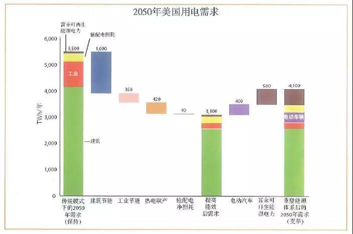 用戶的行為能讓電力部門適合供應(yīng)的轉(zhuǎn)變。建筑和工業(yè)的最終電力使用效益增幅可減小傳統(tǒng)發(fā)電需求。被廣泛采用的熱電聯(lián)產(chǎn)也可以減小這一需求。電動(dòng)汽車使用更多的電力,但不多于其他地方節(jié)約的電力。整體使用量下降25%。保守起見,一體化設(shè)計(jì)的節(jié)電量井未在圖中體現(xiàn)。