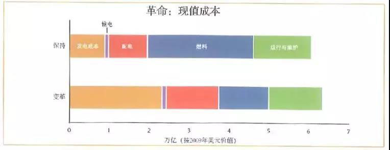“革命情景”的現(xiàn)值成本(2010年)略高于保持情景。盡管其資金成本具有較高不確定性(取決于待續(xù)的技術(shù)成本降低),并且部分超出成本可被“革命情景”較低的燃料成本所避免的不確定性抵消掉。但是,金融經(jīng)濟(jì)學(xué)知識(shí)正在改變這一狀況。