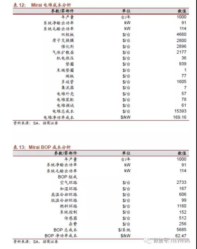 我們再以豐田的Mirai燃料電池為例,根據(jù)測算,Mirai燃料電池系統(tǒng)的成本達到233美元/W,其中73%的成本為電堆成本以114KW功率為標準,1000臺產(chǎn)量下每臺Mirai的燃料電池系統(tǒng)成本為26562美元,2015年Mirai在美售價57500美元,在有補貼政策的情況下,每年銷量為2000多臺。如果產(chǎn)量達到10000臺,燃料電池系統(tǒng)成本將有望下降至9000美元,則基本上可以實現(xiàn)商業(yè)化。