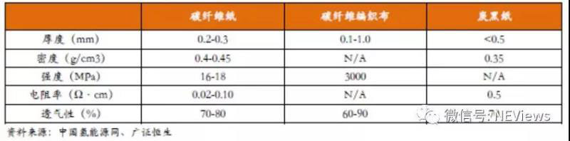 氣體擴散層GDL是最容易實現(xiàn)降本的部分,未來規(guī)模化生產(chǎn)是發(fā)展的重點。GDL位于流場和催化層之間,其作用是支撐催化層、穩(wěn)定電極結(jié)構(gòu),并具有質(zhì)/熱/電的傳遞功能。通常GDL由支撐層(憎水處理過的多孔碳紙或碳布)和微孔層組成(電炭黑和憎水劑構(gòu)成)。目前主要的氣體擴散層有三種:碳纖維紙、碳纖維布和炭黑紙。